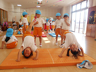 全身を使い、マット・鉄棒 ・水泳・サッカー・組体操などで運動神経を刺激し、健やかな心身の発達を育みます。
