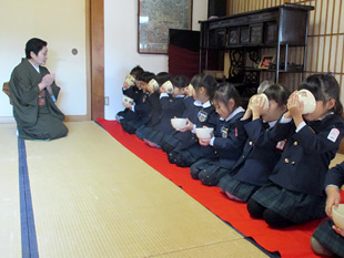 表千家の先生が、挨拶の仕方やお茶碗の持ち方等基本的なお作法を指導いたします。日本文化のマナーのすばらしさを知り、身につけさせたいと考えています。